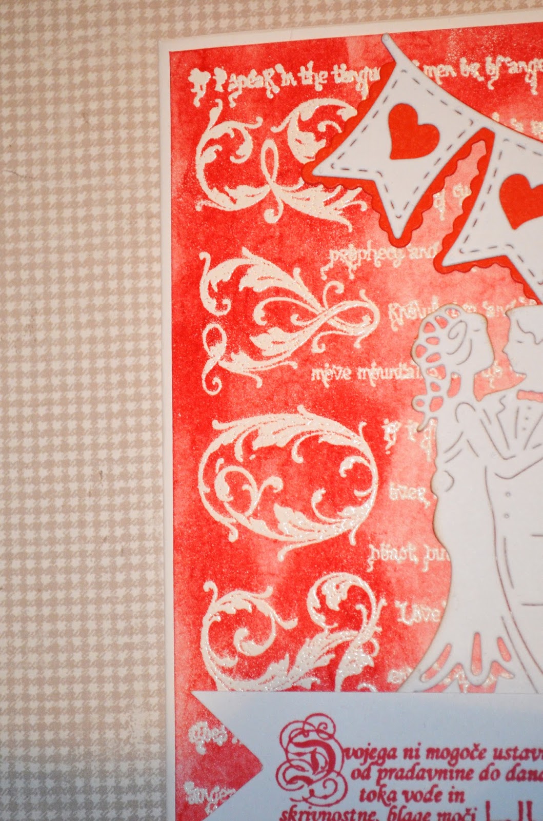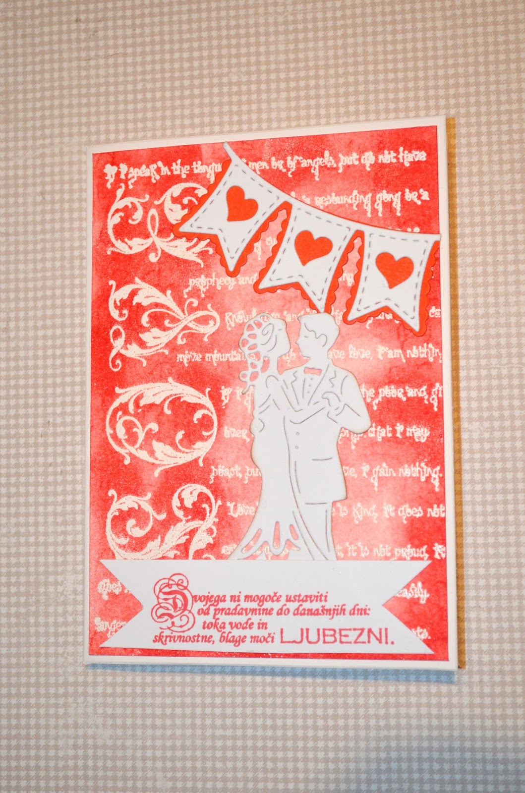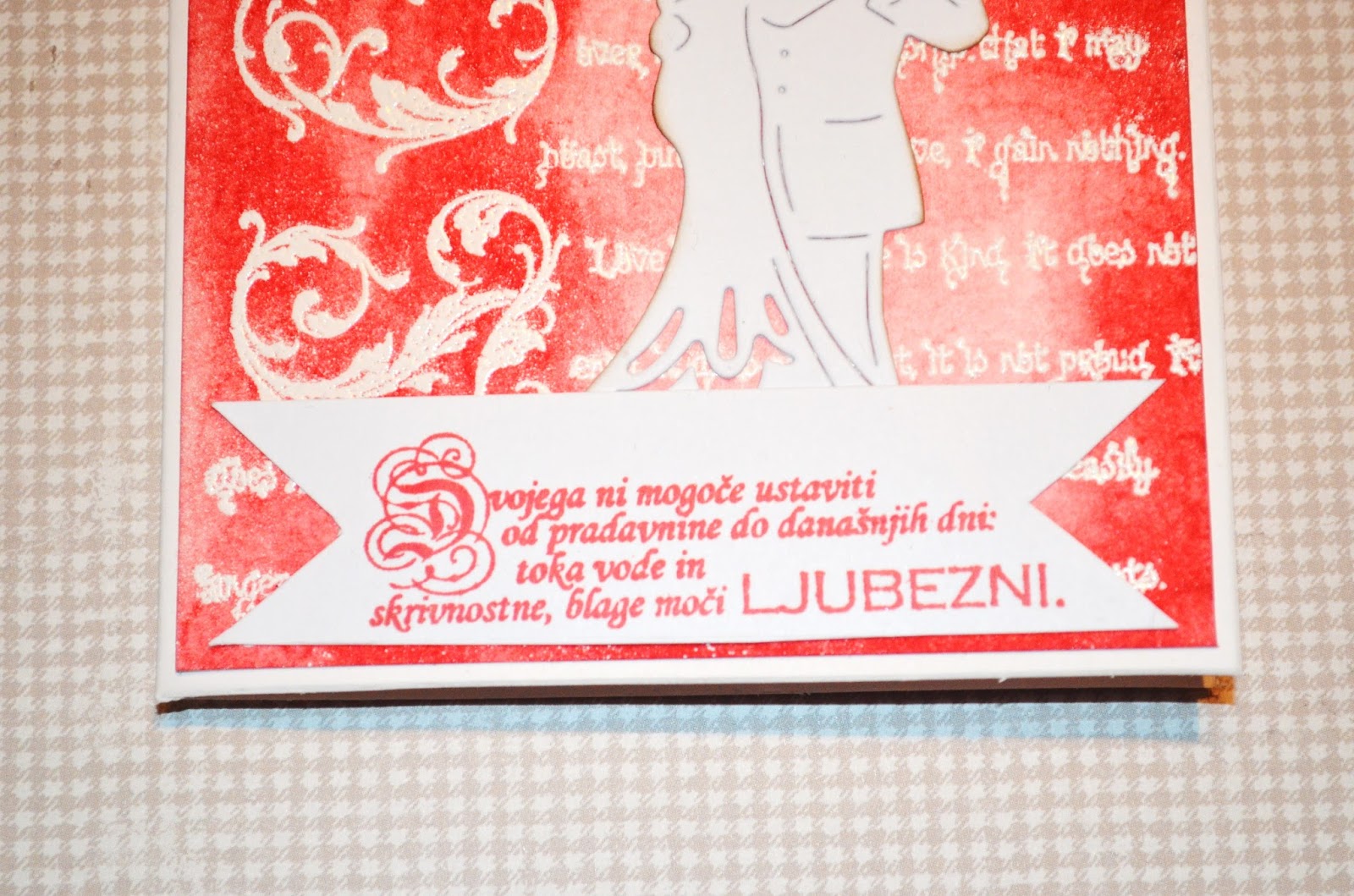 In že je tu valentinovo. Pa zdi se mi kot da smo včeraj praznovali novo leto. Le kam se času tako mudi? Glede na to da je odprtje moje spletne trgovine z ustvarjalnim materialom pred vrati nimam veliko časa za ustvarjanje, pa vendar si ga nekaj le najdem. In tako vam pokažem še mojo voščilnico namenjeno današnjemu prazniku za zaljubljene. Lotila sem se emboss resist tehnike.