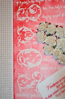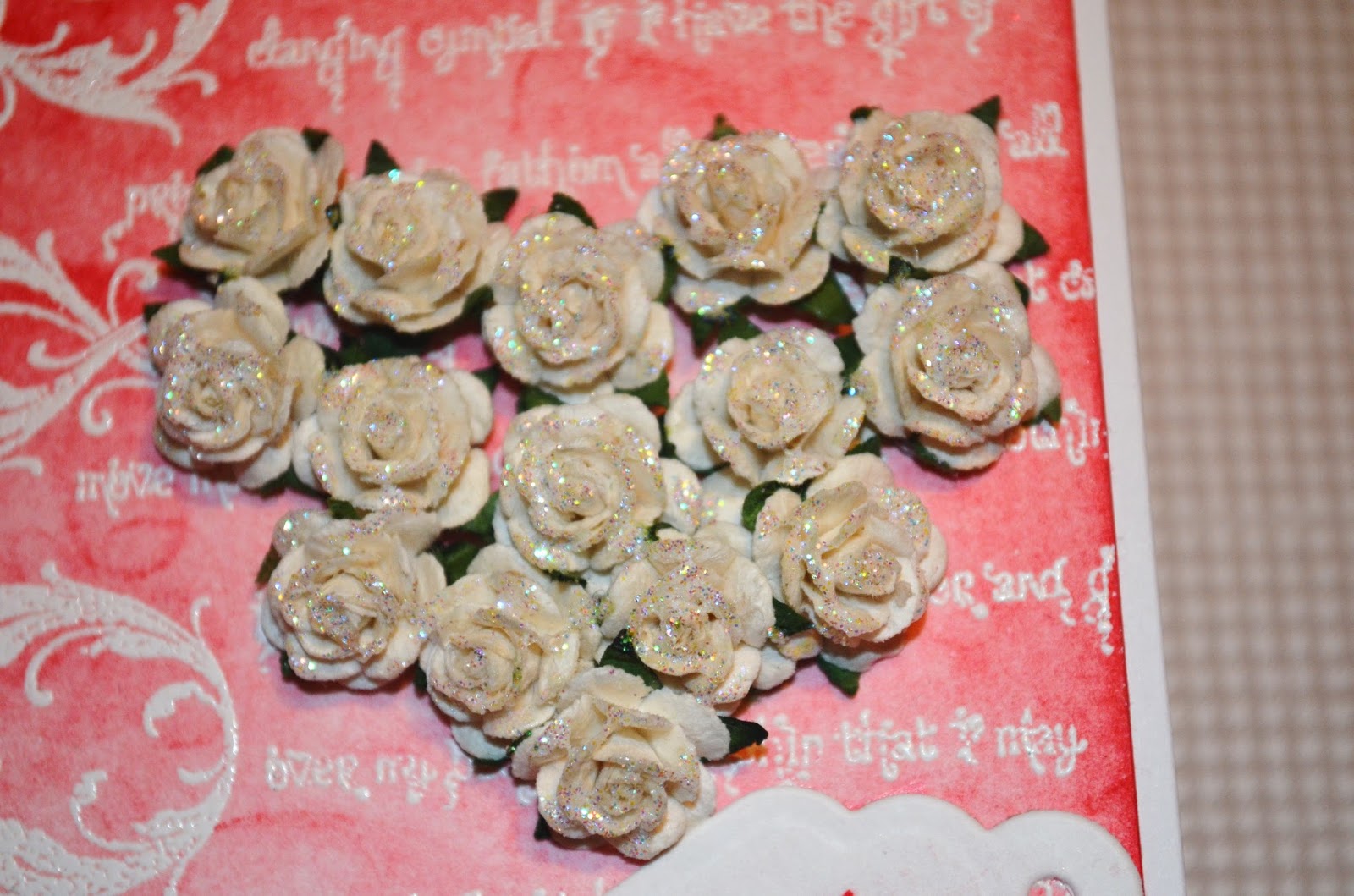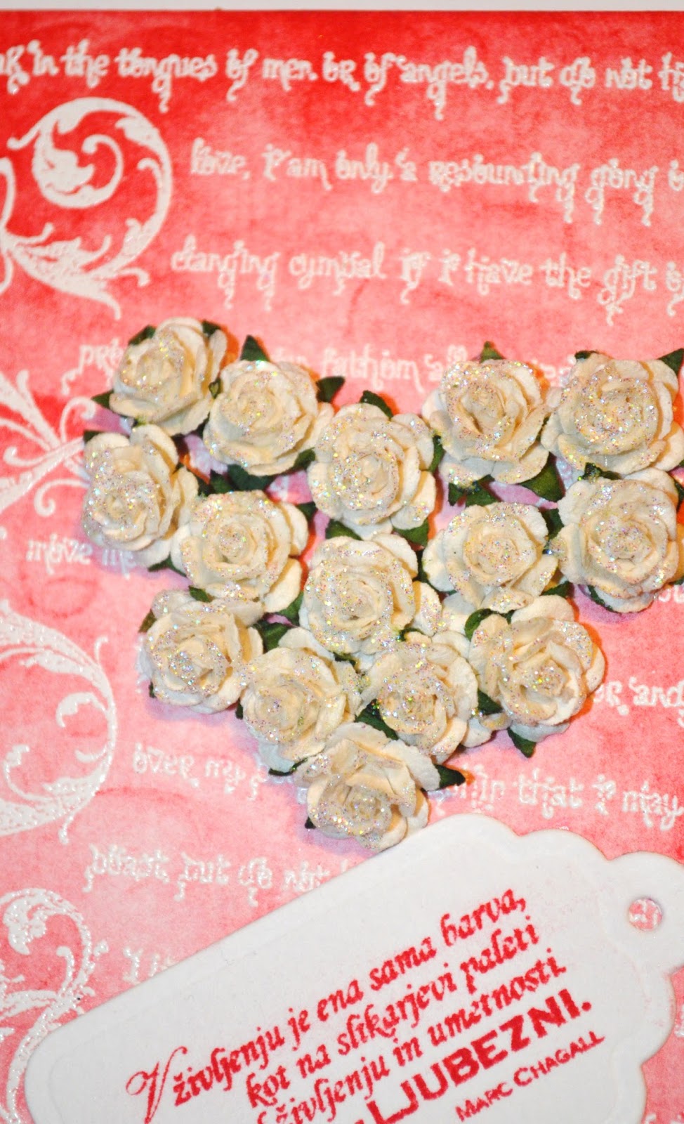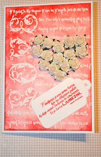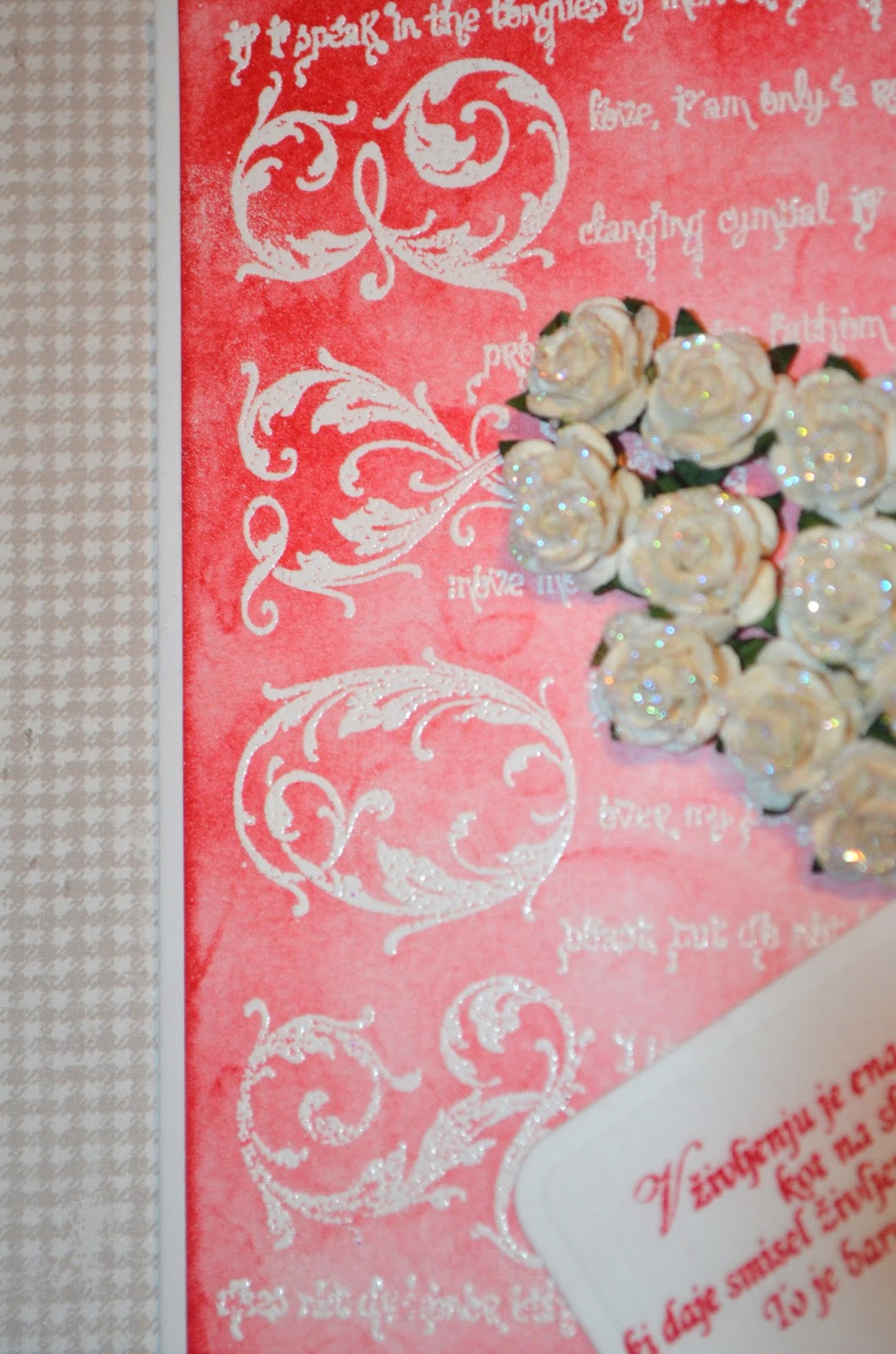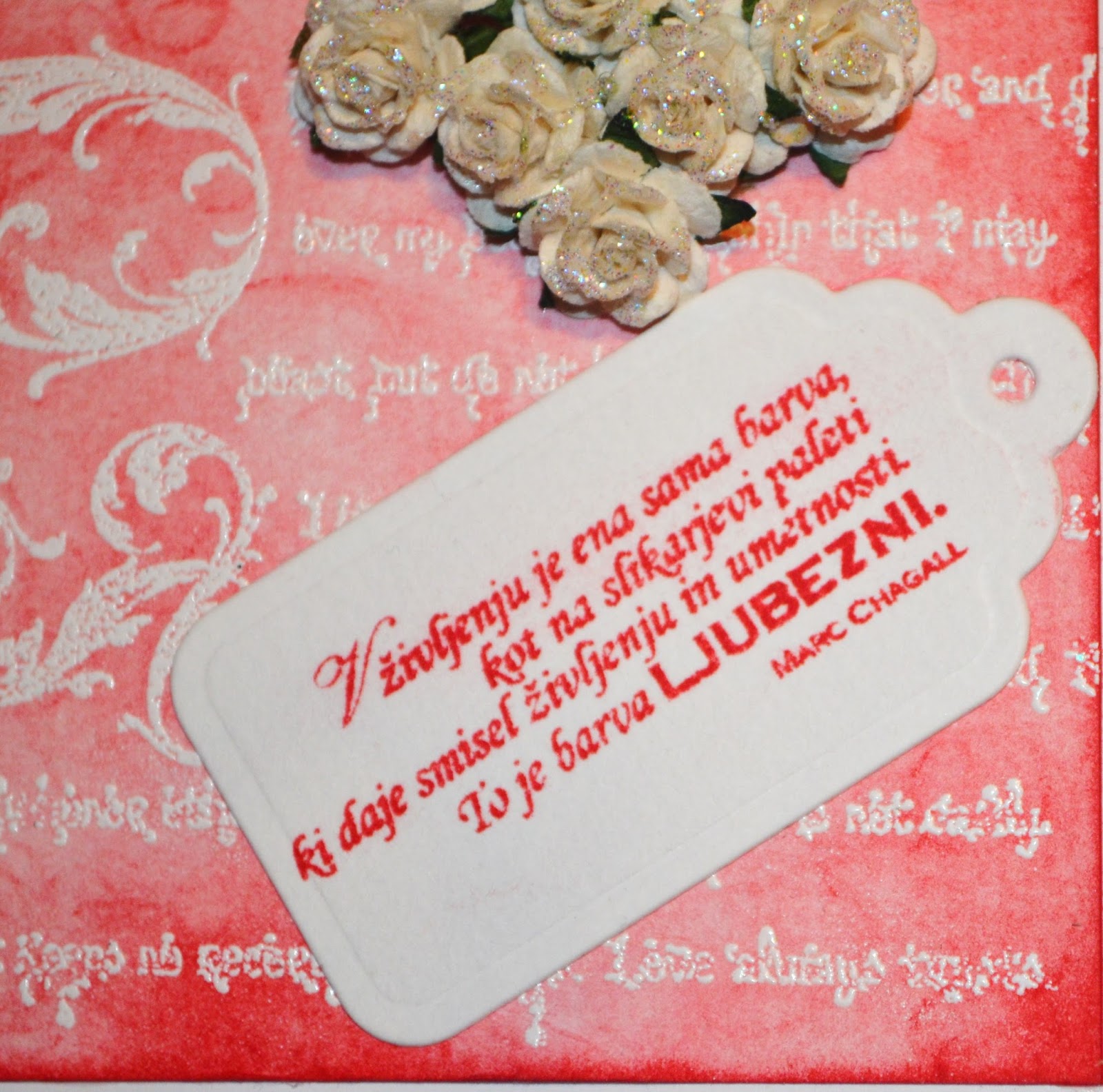 In pa še ena voščilnica v emboss resist tehniki za valentinovo. Uporabila sem isto ozadje, kot pri prejšnji voščilnici, le da sem dodala še srce iz vrtnic. Vrtnice sem še dodatno okrasila z bleščicami in dodala še tagec z mislijo.