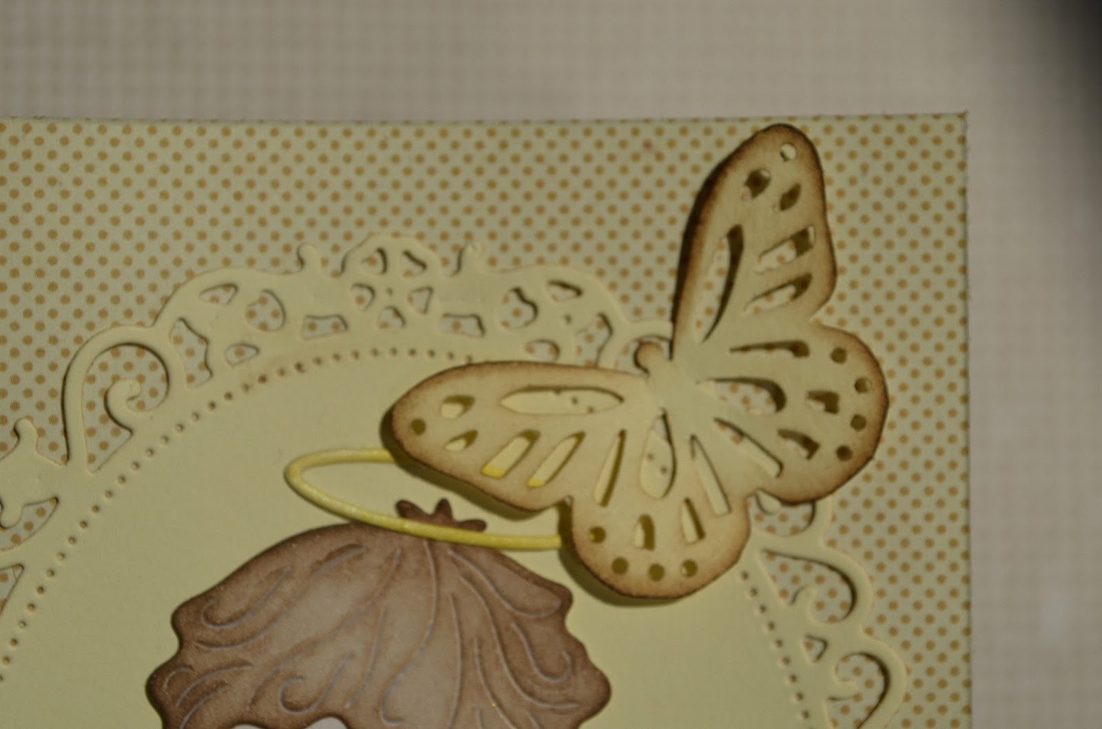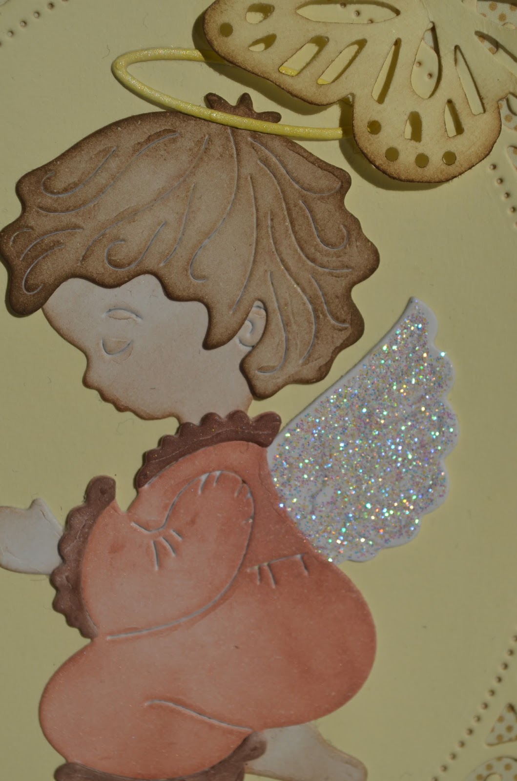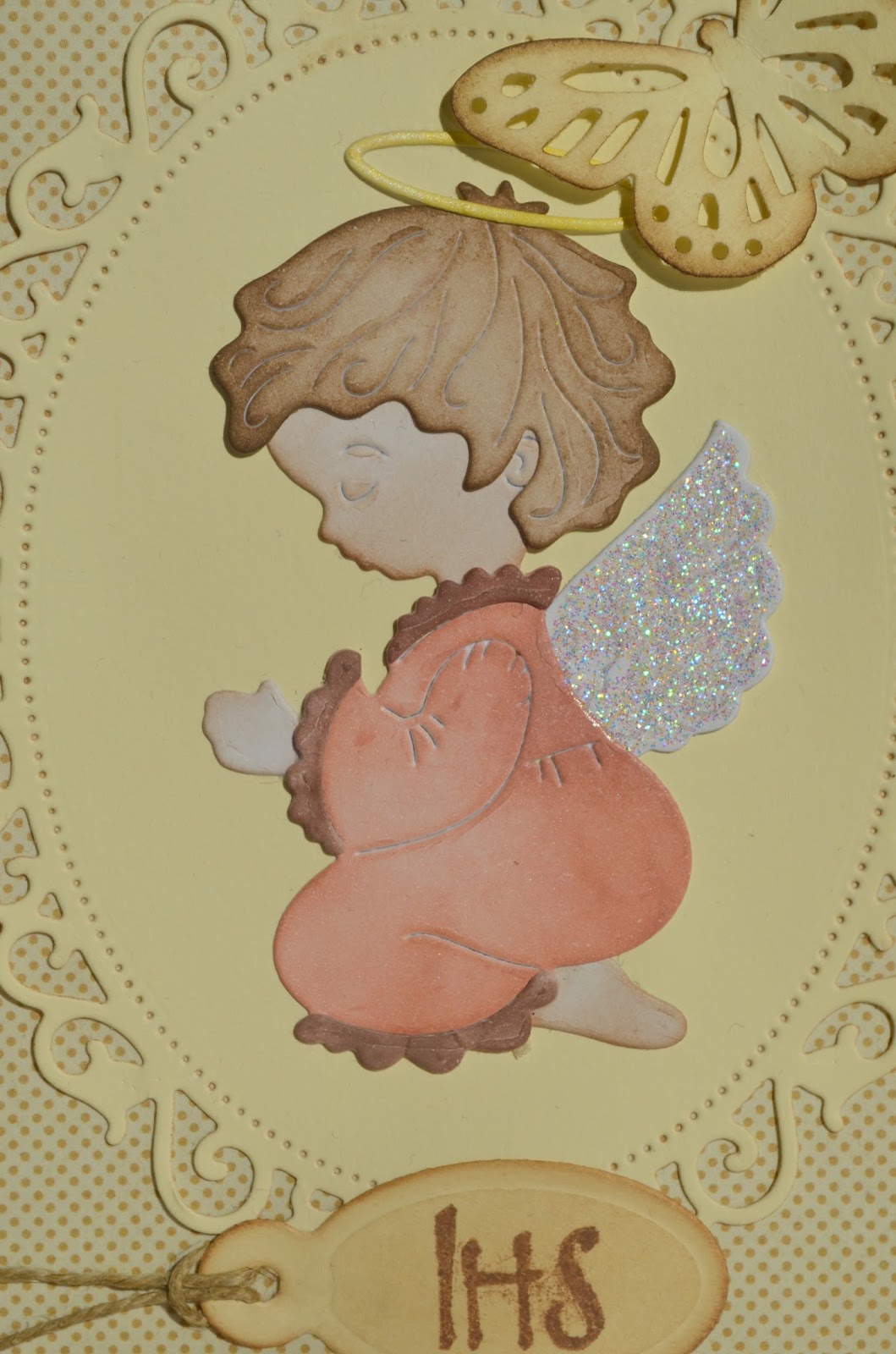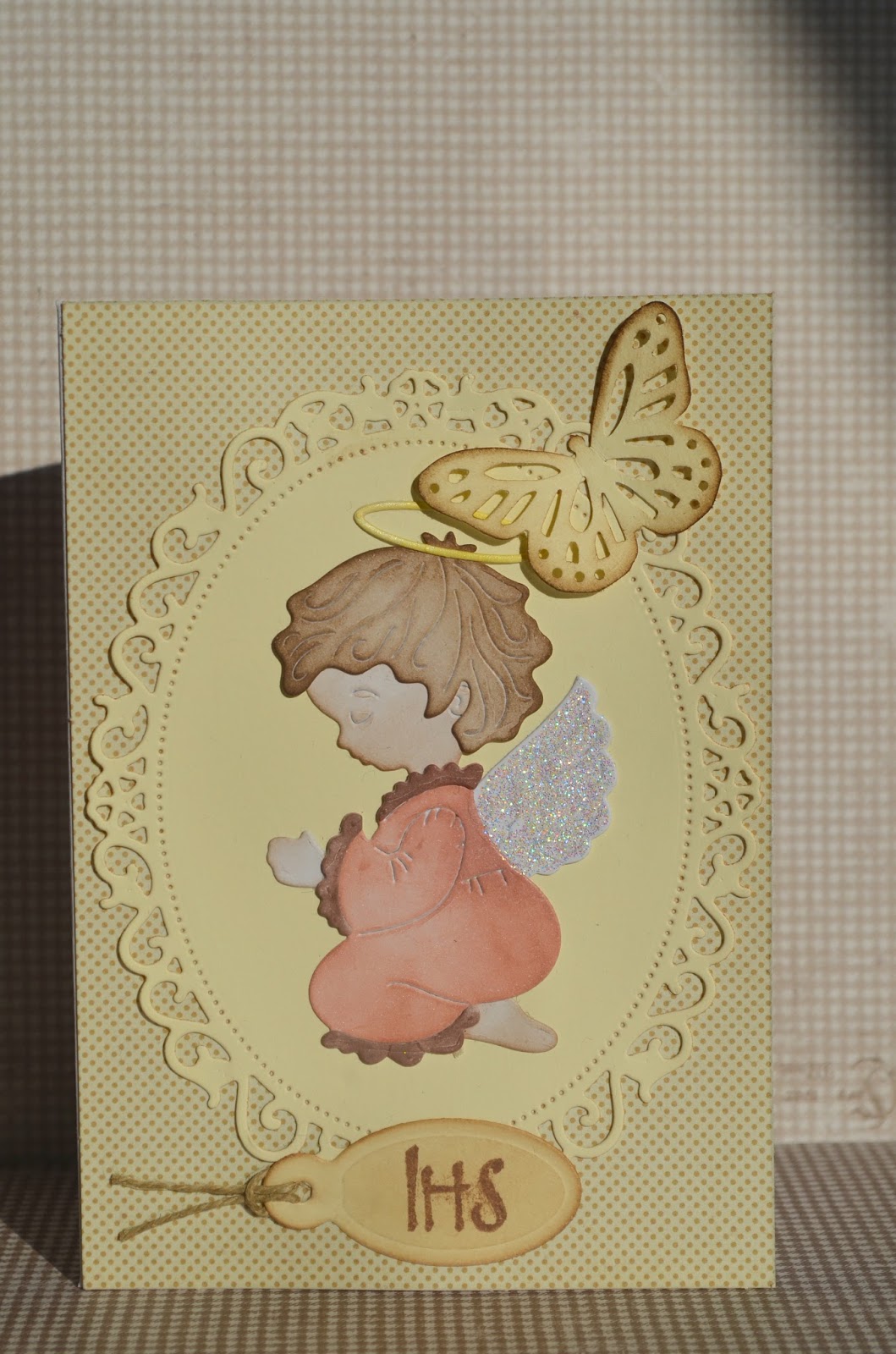 Že pred časom sem naredila voščilnico za prvo sveto obhajilo. Uporabila sem Cottage cutz šablono, ki sem jo kupila. Ena izmed mojih zadnjih pridobitev. Voščilnica je narejena v nevtralnih tonih in tako primerna za punčko ali fantka. Voščilnica je minimalistična ampak še vedno dovolj vsega. Dodala sem še metuljčka Marthe Stewart in nekaj bleščic na krila angelčka.